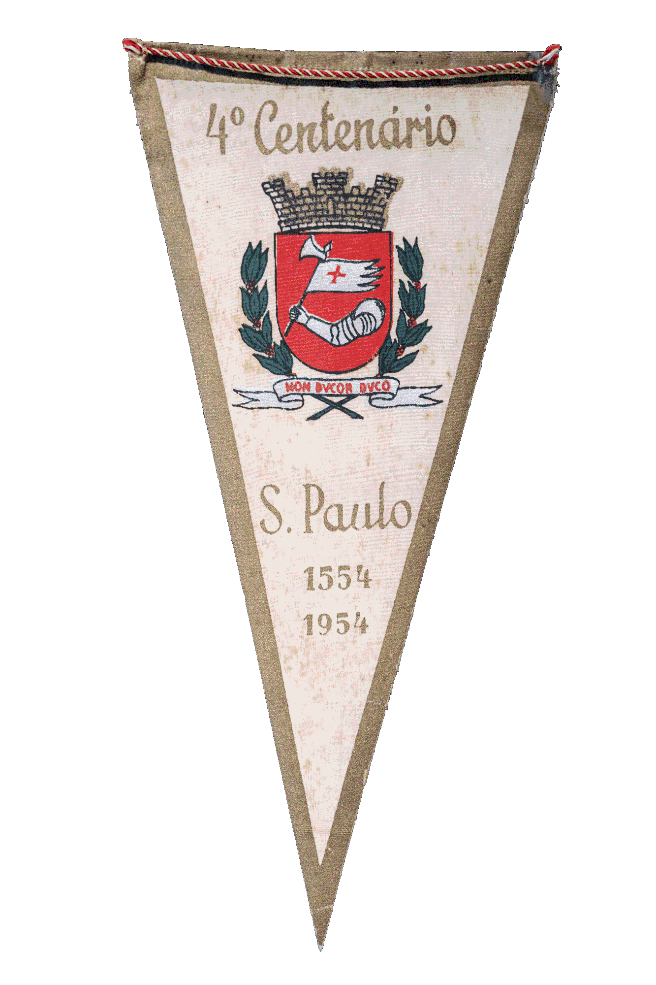 In 1954, commemorative pennants were the most intimate way of declaring belonging. Fabric, color, coat of arms — each piece condensed the identity of its bearer. The IV Centenary pennants bring together all the symbolism of the celebrations: Niemeyer's Ascending Volute, the State Coat of Arms, the Monument to the Bandeiras, Ibirapuera, the Bandeirantes, the Indigenous Peoples, and the immigrants. It was in this aesthetic — between the artisanal and the heraldic — that Sartoria San Paolo found the visual language for the SSP 1954 label.